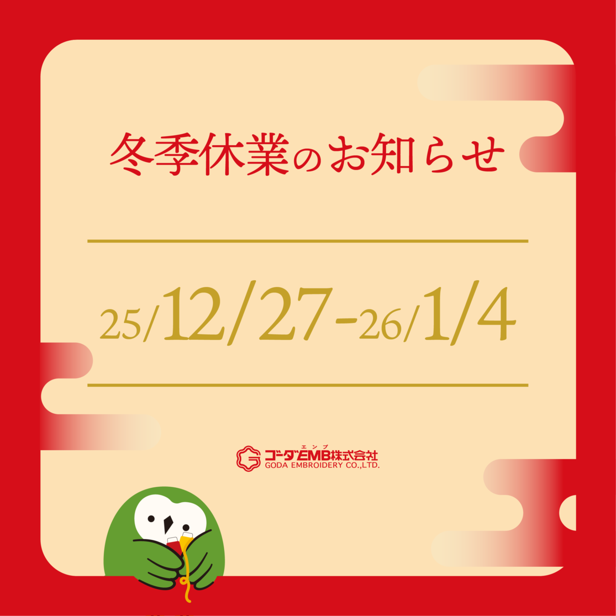 冬季休業のお知らせ 12/26~1/4